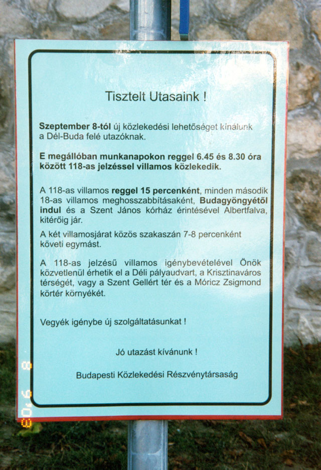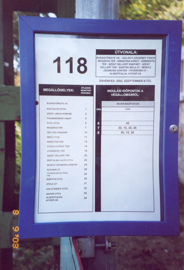 Tabla_118.jpg 118.84 KB A 118-as viszonylat "menetrendje" Buda- gyöngye megállóban. Ha a járat a Szép- ilona kocsiszínig szállítana utasokat, való- színû nagyobb "sikere" lenne. |